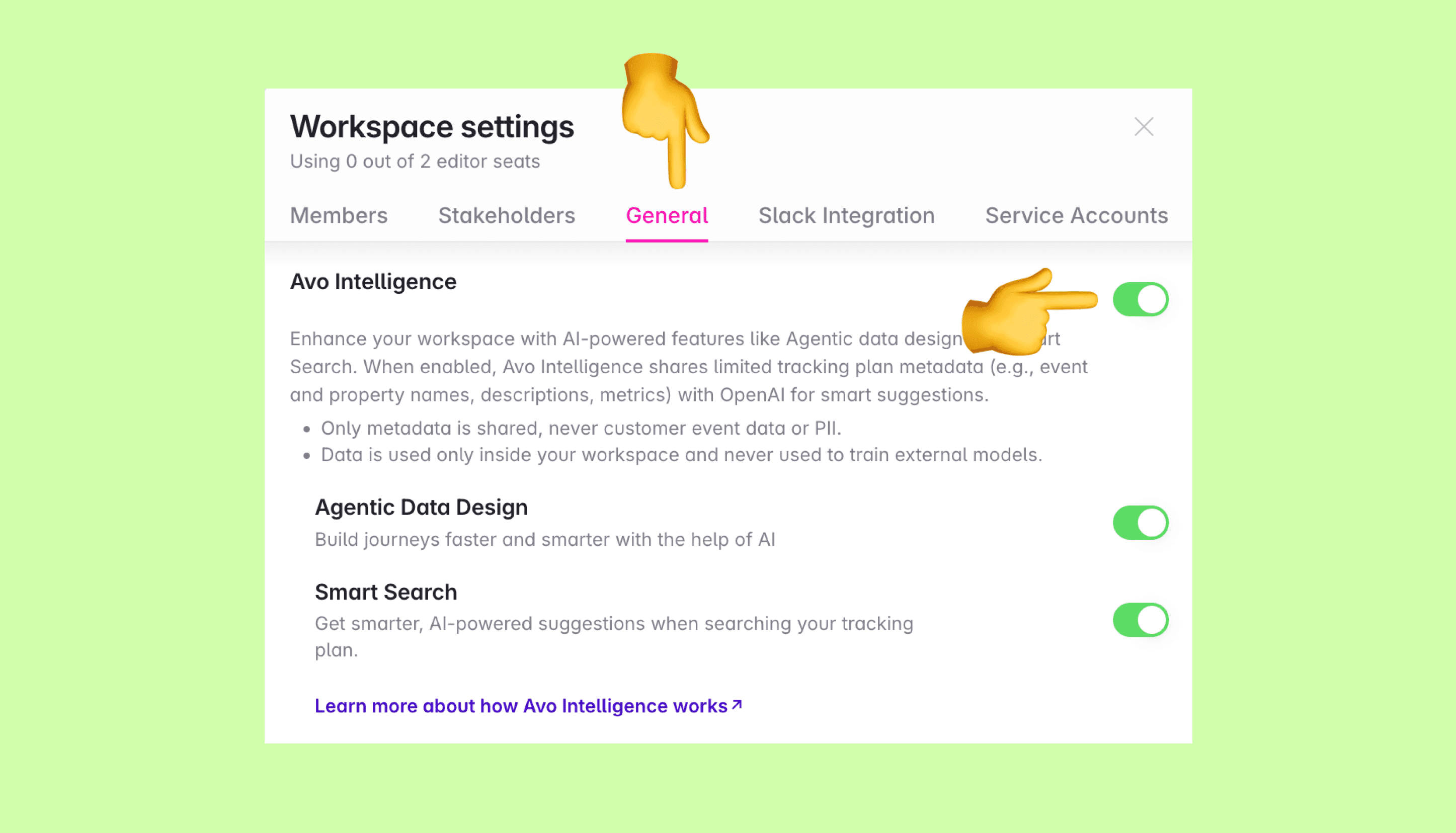 2. Toggle the “Avo Intelligence” switch to enable Avo Intelligence.