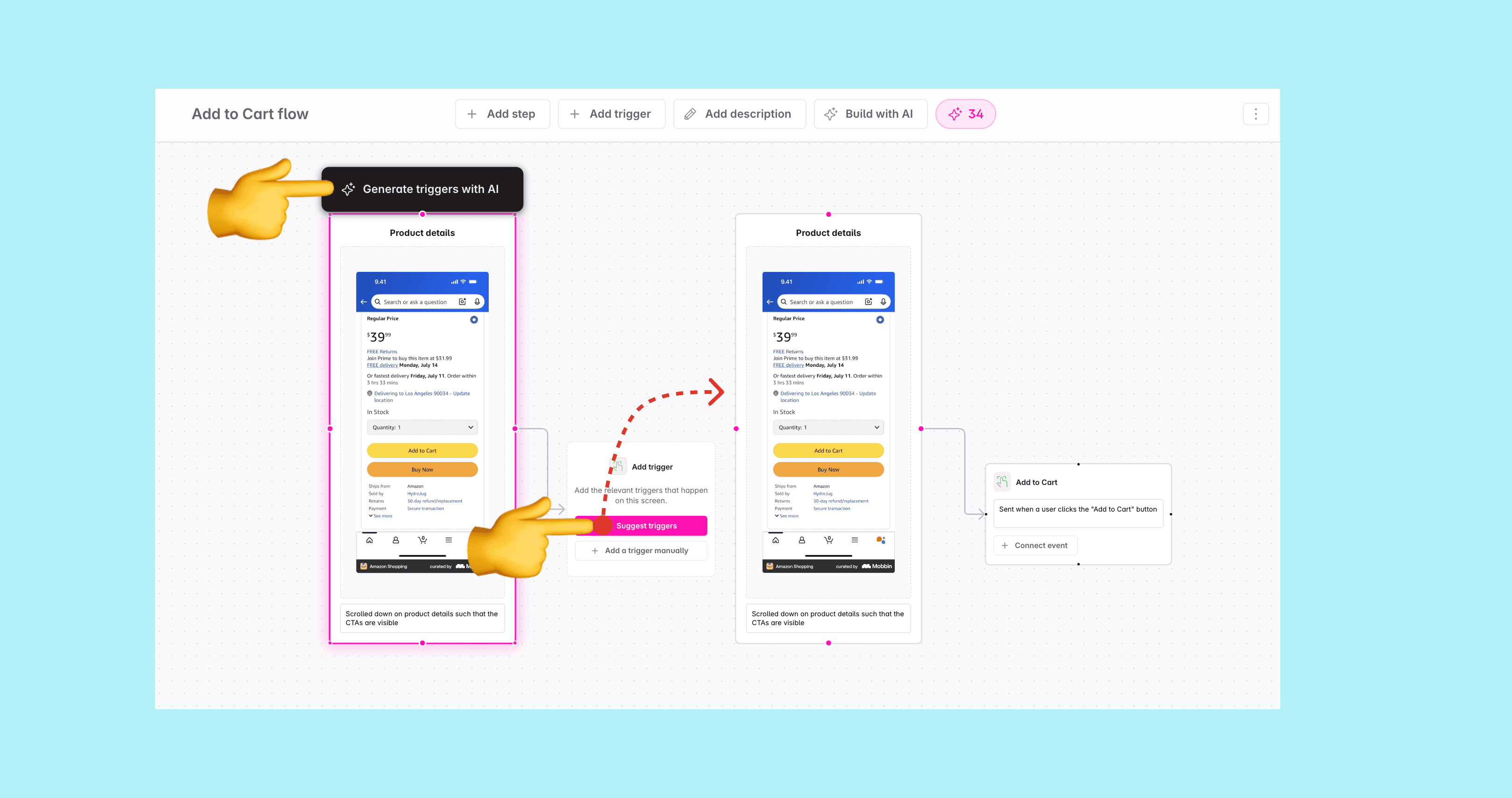 • Product images are analyzed by AI to propose triggers and concise interaction descriptions for each step.